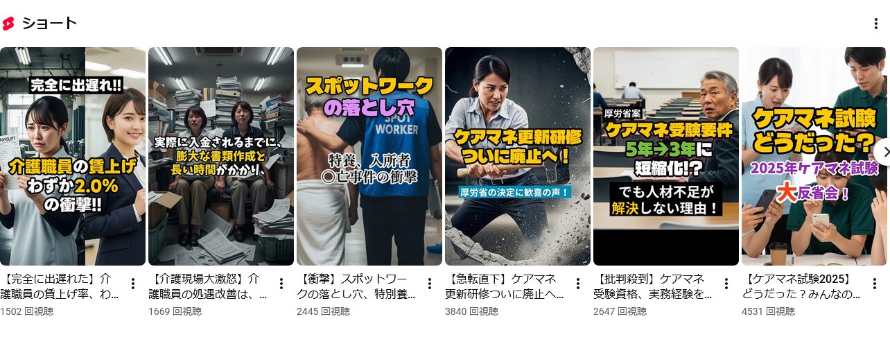 私たちのYoutubeチャンネルでは毎週ショート動画形式で介護業界の最新トピックスを紹介しています。