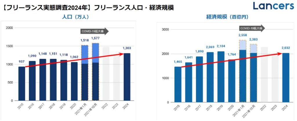 参照:Biz/Zine「2024年のフリーランス人口は1303万人、経済規模は20兆3200億円に達する—ランサーズ調査」